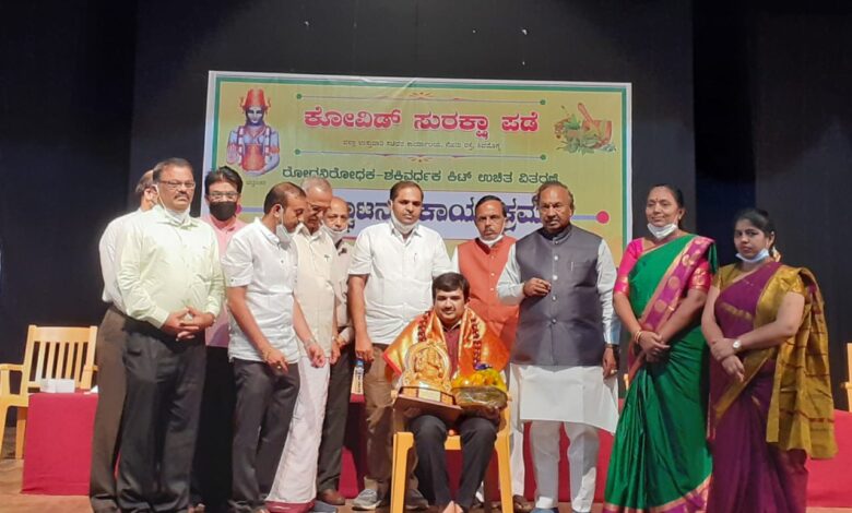 ಇಂದು ಶಿವಮೊಗ್ಗದ ಕುವೆಂಪು ರಂಗಮಂದಿರದಲ್ಲಿ *ಕೋವಿಡ್ ಸುರಕ್ಷಾ ಪಡೆ, ಶಿವಮೊಗ್ಗ* ವತಿಯಿಂದ ದೇಶದಲ್ಲೇ ಪ್ರಪ್ರಥಮವಾಗಿ ಶಿವಮೊಗ್ಗ ನಗರದ ಪ್ರತಿ ಕುಟುಂಬಗಳಿಗೆ ಉಚಿತವಾಗಿ *ಆರೋಗ್ಯ ವರ್ಧಕ- ರೋಗ ನಿರೋಧಕ ಶಕ್ತಿ* ಯುಳ್ಳ ಆಯುರ್ವೇದಿಕ್ ಔಷಧೀಯ ಕಿಟ್ಟುಗಳನ್ನು ಉಚಿತವಾಗಿ ನೀಡುವ ಕಾರ್ಯಕ್ರಮದ ಉದ್ಘಾಟನೆಯನ್ನು ಪ್ರಖ್ಯಾತ ಆಯುರ್ವೇದ *ಡಾಕ್ಟರ್ ಶ್ರೀ ಗಿರಿಧರ್ ಕಜೆ* ಅವರು ಉದ್ಘಾಟಿಸಿದರು.