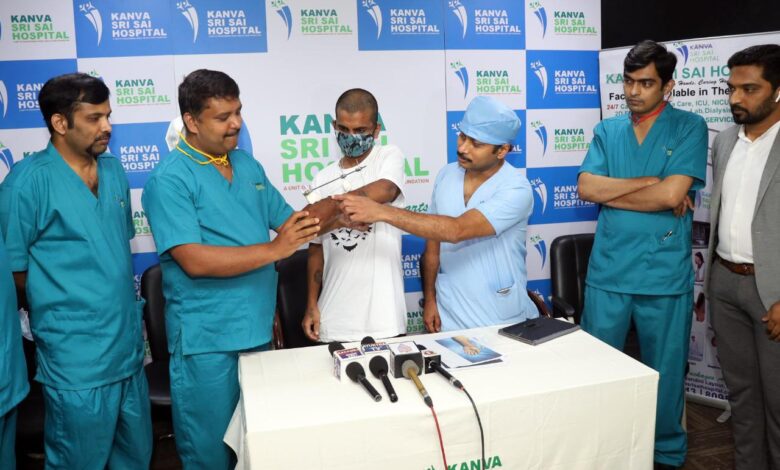ಬೆಂಗಳೂರು ಜುಲೈ 15: ದೇಹದಿಂದ ವಿಭಜನೆ ಅಗಿದ್ದ ಕೈ ಮಣಿಕಟ್ಟನ್ನು ಮತ್ತೊಮ್ಮೆ ಜೋಡಿಸಿ ಶೇಕಡಾ 90 ರಷ್ಟು ಚಲನೆ ಸಾಧ್ಯವಾಗುವಂತಹ ಕ್ಲಿಷ್ಟಕರ ಶಸ್ತ್ರಚಿಕಿತ್ಸೆಯನ್ನು ಬೆಂಗಳೂರು ನಗರದ ರಾಘವೇಂದ್ರ ರೂರಲ್ ಹೆಲ್ತ್ ಕೇರ್ ಫೌಂಡೇಶನ್ ನ ಕಣ್ವ ಶ್ರೀ ಸಾಯಿ ಆಸ್ಪತ್ರೆಯ ವೈದ್ಯರು ಮಾಡಿದ್ದಾರೆ.