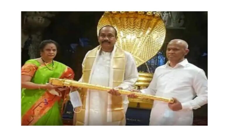 ಹೈದರಾಬಾದ್ನ ಭಕ್ತ ಎಂ.ಶ್ರೀನಿವಾಸ್ ಪ್ರಸಾದ್ ಮತ್ತು ಅವರ ಪತ್ನಿ ವೆಂಕಟೇಶ್ವರ ಸ್ವಾಮಿಗೆ 4 ಕೋಟಿ ರೂಪಾಯಿ ಮೌಲ್ಯದ 6.5 ಕೆಜಿ ತೂಕದ ಚಿನ್ನದ ಖಡ್ಗವನ್ನು ದೇವರಿಗೆ ಅರ್ಪಿಸಿದ್ದಾರೆ. ತಿರುಮಲ ತಿರುಪತಿ ದೇವಸ್ಥಾನ(ಟಿಟಿಡಿ) ಅಧಿಕಾರಿಗಳು ಈ ಖಡ್ಗವನ್ನು ಸ್ವೀಕರಿಸಿದ್ದಾರೆ.