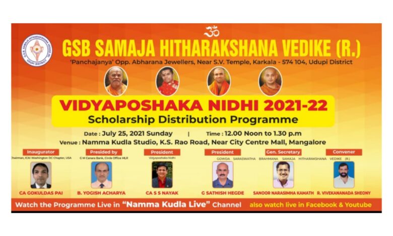 ಜಿ .ಎಸ್. ಬಿ ಸಮಾಜ ಹಿತರಕ್ಷಣಾ ವೇದಿಕೆ (ರಿ. ) ಜುಲೈ 25: ವಿದ್ಯಾ ಪೋಷಕ ನಿಧಿ ವಿದ್ಯಾರ್ಥಿವೇತನ ವಿತರಣಾ ಸಮಾರಂಭ