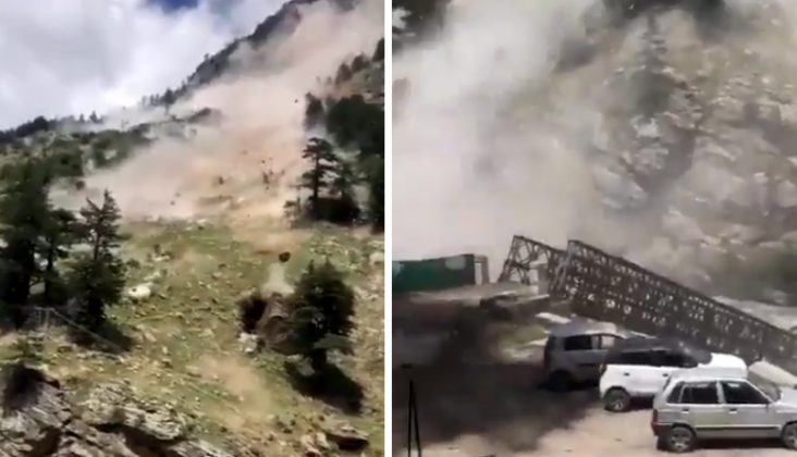 ಸಾಮಾಜಿಕ ಜಾಲತಾಣದಲ್ಲಿ ಭೂಕುಸಿತದ ವಿಡಿಯೋ ಹಂಚಿಕೊಳ್ಳಲಾಗಿದೆ. ವಿಡಿಯೋದಲ್ಲಿ ಬಂಡೆಗಳ ಕೆಳಗಿನ ಕಣಿವೆಯಲ್ಲಿ ಉರುಳಿ ಸೇತುವೆಯ ಒಂದು ಭಾಗ ಮುರಿದು ನದಿಗೆ ಬೀಳುತ್ತಿರುವ ದೃಶ್ಯ ಸೆರೆಯಾಗಿದೆ.