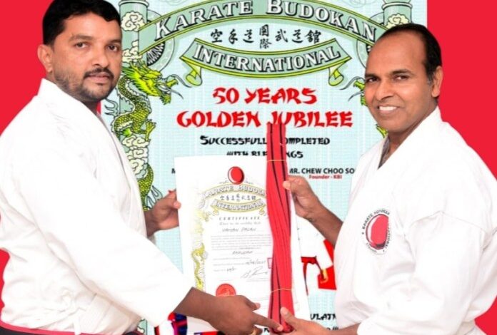 ಉಡುಪಿ : ಬುಡೋಕಾನ್ ಕರಾಟೆ ಎಂಡ್ ಸ್ಪೋರ್ಟ್ಸ್ ಅಸೋಸಿಯೇಶನ್ ನ ಅಧ್ಯಕ್ಷ ಹಾಗೂ ಕರಾಟೆ ಮುಖ್ಯ ಶಿಕ್ಷಕರು, ಮುಖ್ಯ ಪರೀಕ್ಷಕ ಶಿಹಾನ್ ವಾಮನ್ ಪಾಲನ್ ಅಂಬಲಪಾಡಿ ಕರಾಟೆ ಕ್ರೀಡೆಯ ಪ್ರಮುಖ ಘಟ್ಟವಾಗಿರುವ ಬ್ಲ್ಯಾಕ್ ಬೆಲ್ಟ್ ಆರನೇ ಪದವಿಯನ್ನು ಪಡೆಯುವುದರೊಂದಿಗೆ ಶಿಹಾನ್ ಶ್ರೇಣಿಯಿಂದ ರೆಂಷಿ ಶ್ರೇಣಿಗೆ ಪದೋನ್ನತಿ ಹೊಂದಿದ್ದಾರೆ.