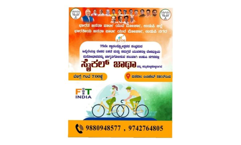 ಉಡುಪಿ: ೭೫ ನೇ ಸ್ವಾತಂತ್ರ್ಯೋತ್ಸವದ ಪ್ರಯುಕ್ತ ದೇಶದ ಏಕತೆ ಮತ್ತು ಸಮಗ್ರತೆ ಹಾಗೂ ದೇಶಭಕ್ತಿಯ ಮನೋಭಾವ ಜಾಗೃತಿಗೊಳಿಸುವ ಸಲುವಾಗಿ ಬಿಜೆಪಿ ಯುವ ಮೋರ್ಚಾ ಉಡುಪಿ ಜಿಲ್ಲೆ ಹಾಗೂ ಬಿಜೆಪಿ ಯುವ ಮೋರ್ಚಾ ಉಡುಪಿ ನಗರದ ವತಿಯಿಂದ ಉಡುಪಿ ನಗರದಲ್ಲಿ ಆಗಸ್ಟ್ 15ರಂದು ಸೈಕಲ್ ಜಾಥಾ ನಡೆಯಲಿದೆ.