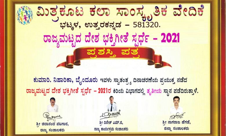 ಮಿತ್ರಕೂಟ ಕಲಾ ಸಾಂಸ್ಕೃತಿಕ ವೇದಿಕೆ ಭಟ್ಕಳ (ಉತ್ತರಕನ್ನಡ) ಇವರು ಆಯೋಜಿಸಿದ ರಾಷ್ಟ್ರಮಟ್ಟದ ದೇಶಭಕ್ತಿಗೀತೆ ಸ್ಪರ್ಧೆ 2021 ಕಿರಿಯರ ವಿಭಾಗದಲ್ಲಿ ಕುಮಾರಿ ನಿಹಾರಿಕಾ ದೇವಾಡಿಗ ತೃತೀಯ ಸ್ಥಾನ ಪಡೆದಿರುತ್ತಾಳೆ.ಇವಳು ಕೋಟೇಶ್ವರ ಅಗ್ನಿಶಾಮಕ ಠಾಣೆಯಲ್ಲಿ ಲೀಡಿಂಗ್ ಪೈರ್ ಮ್ಯಾನ್ ಆಗಿ ಕರ್ತವ್ಯ ನಿರ್ವಹಿಸುತ್ತಿರುವ ಬಿಜೂರಿನ ರವೀಂದ್ರ ದೇವಾಡಿಗ ಹಾಗೂ ಶಿಕ್ಷಕಿಯಾದ ರವಿಕಲಾ ದೇವಾಡಿಗ ದಂಪತಿಯ ಪುತ್ರಿ
